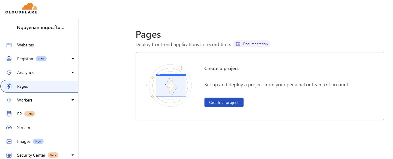 • Mình sẽ tạo một page trên cloudflare bằng cách ấn vào “create a project”